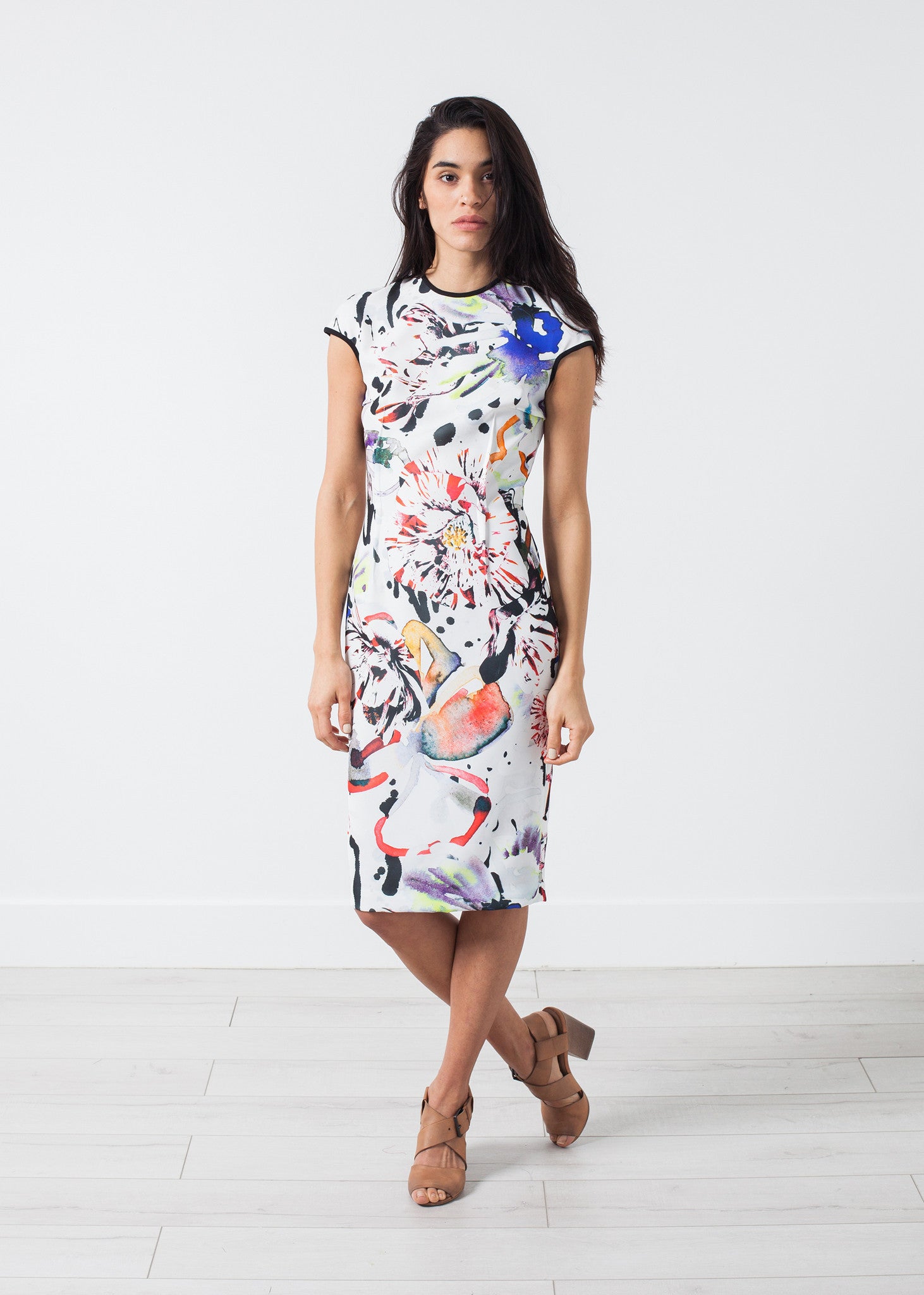 The Dream Dress by Amelia Toro is a cacophony of color for an eye catching display. Slim silhouette, crew neckline, and capped sleeves complete the ensemble. Exposed darts. Invisible zip closure at center back neck. Color Floral. 100% Polyester. Made in Columbia. Ashley is wearing a Size 2.
